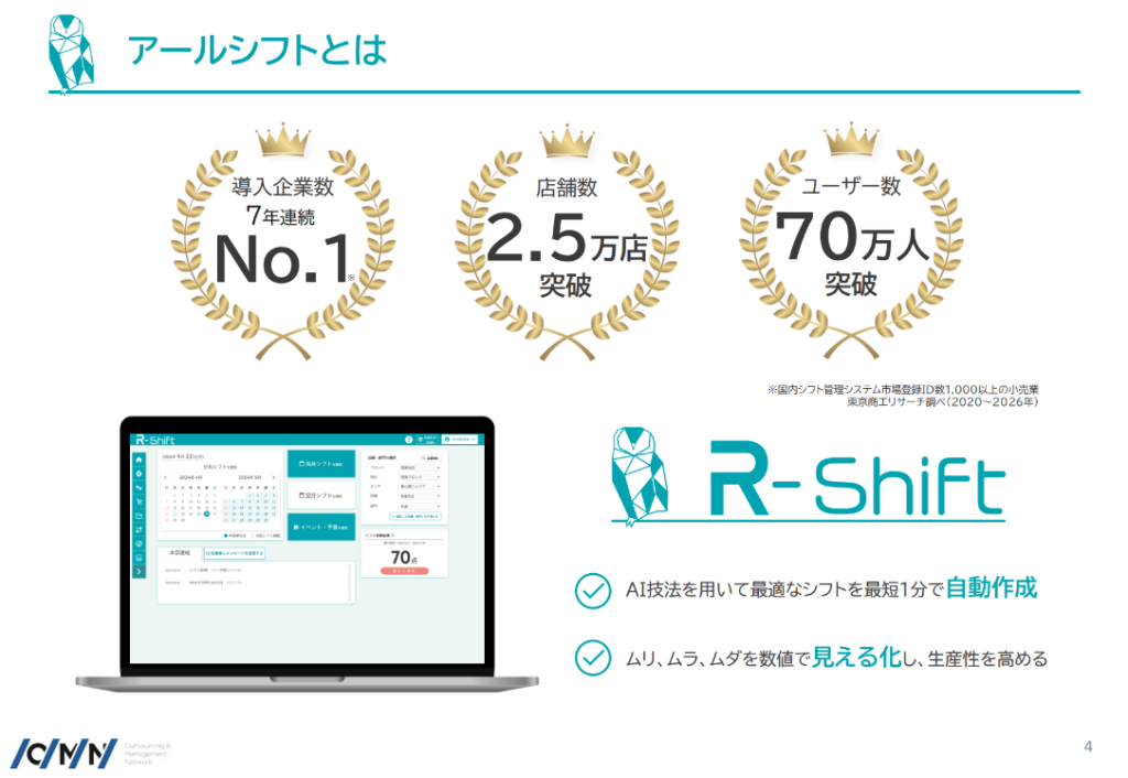 アールシフトは、小売業やサービス業のシフト管理に特化したシステムです。