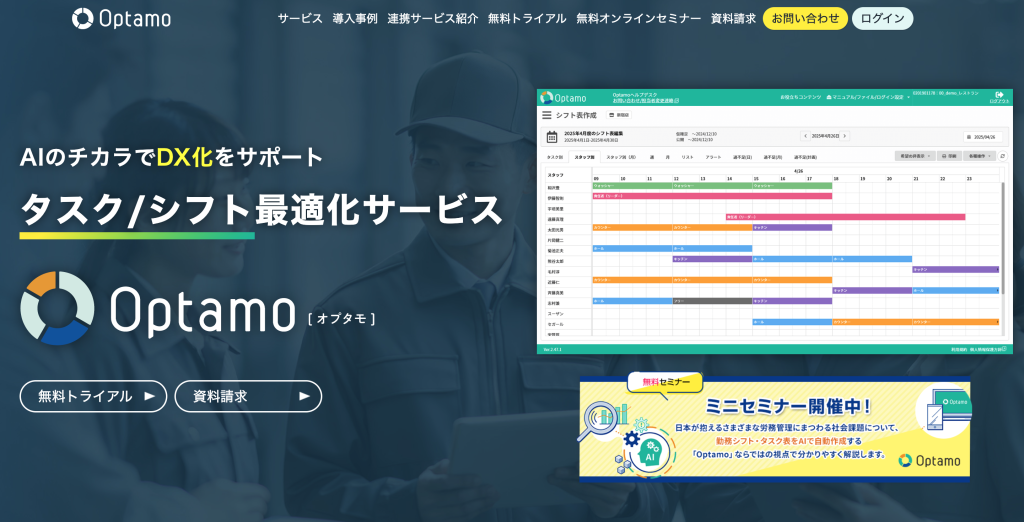 Optamoは、統計解析を元に、組み合わせ最適化アルゴリズムを応用したシフト表を自動作成するクラウドサービスです。