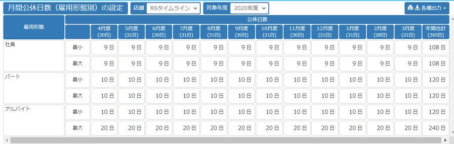 シフト作成の条件設定(必須)⇒月間公休日数(雇用形態別)